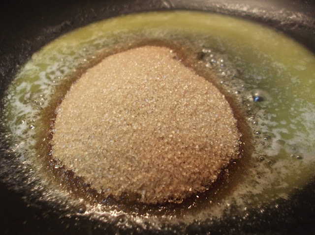 -En una sarten hacemos un caramelo ligero con el azúcar y la mantequilla.